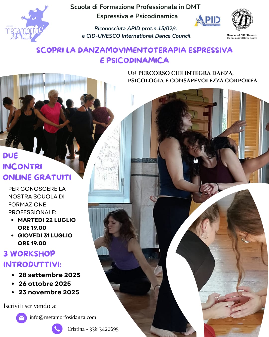 Un workshop per liberare creatività ed energia interiore, trasformando emozioni e pensieri in movimento autentico e rigenerante. Connettendoci con il gruppo, esploreremo una rinascita personale e collettiva, scoprendo nuove risorse e potenzialità. Danzeremo per nutrire l’anima e celebrare la bellezza della connessione umana. Non sono richieste competenze tecniche!